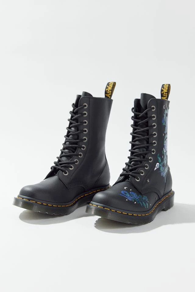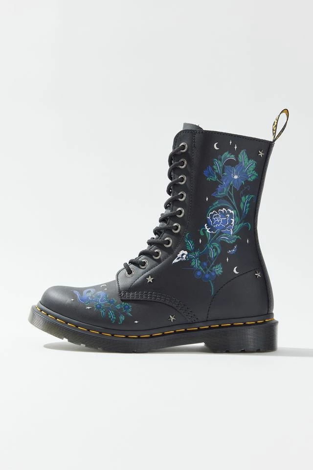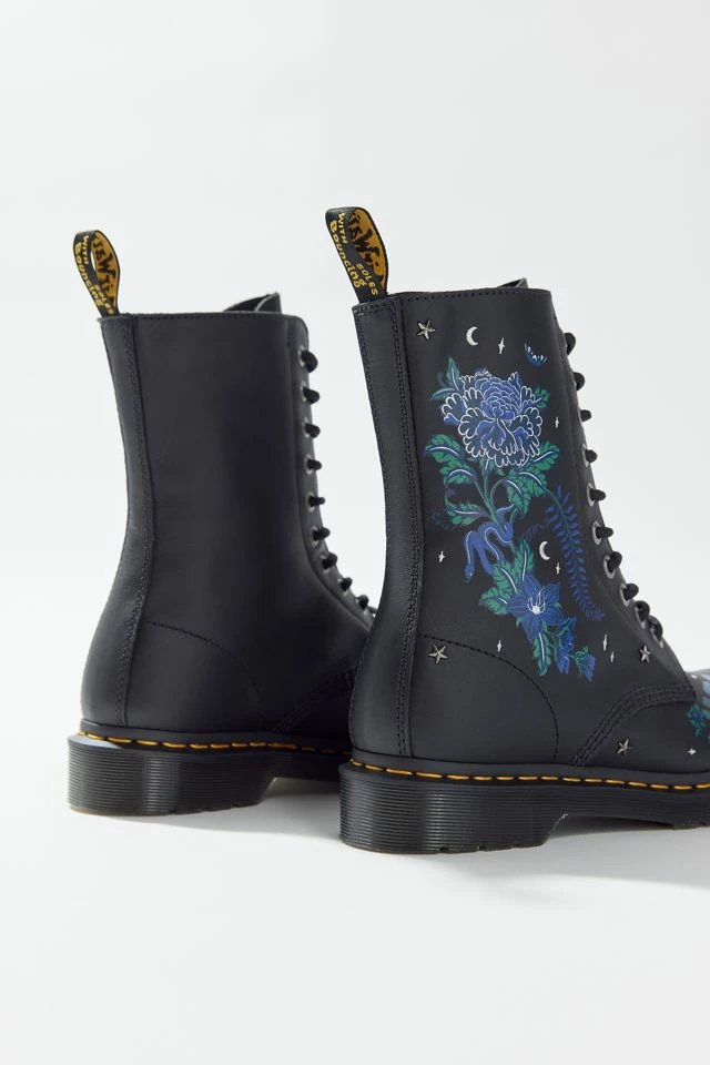 Leather combat boots from Dr. Martens with floral detailing. Smooth leather upper in a 10-eye lace front silhouette with a branded pull tab at the ankle collar for an easy on/off. Finished with a Goodyear-welted, air-cushioned platform rubber outsole for a little lift and a lot of grip.
