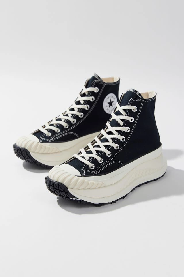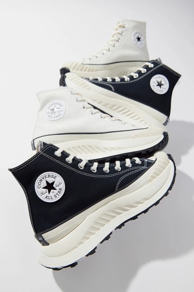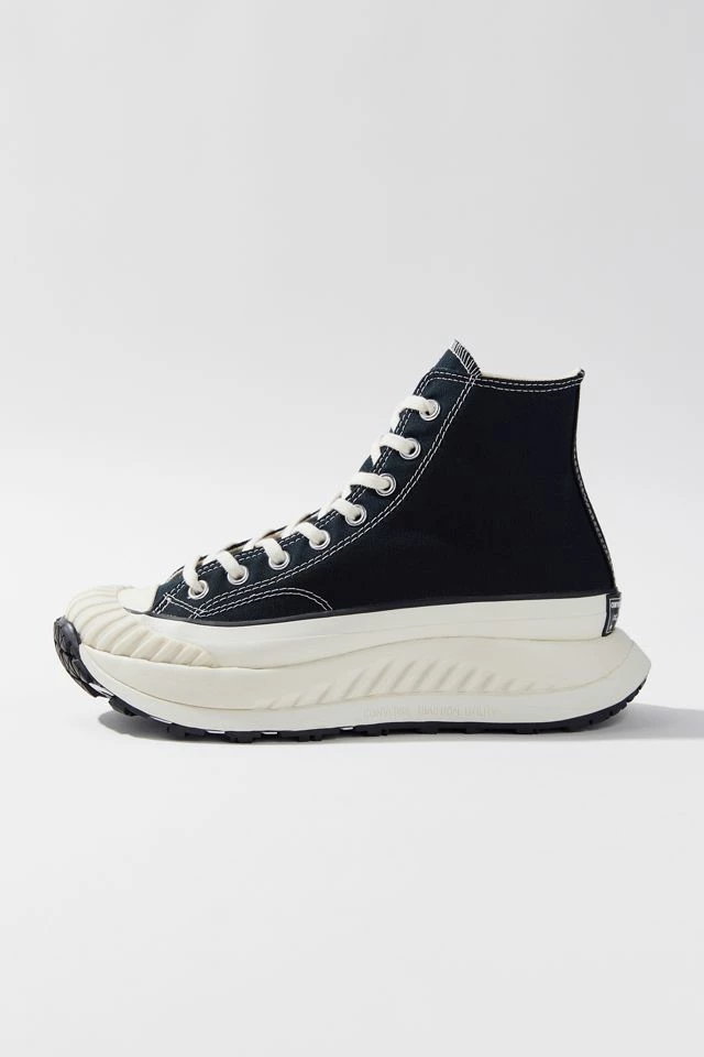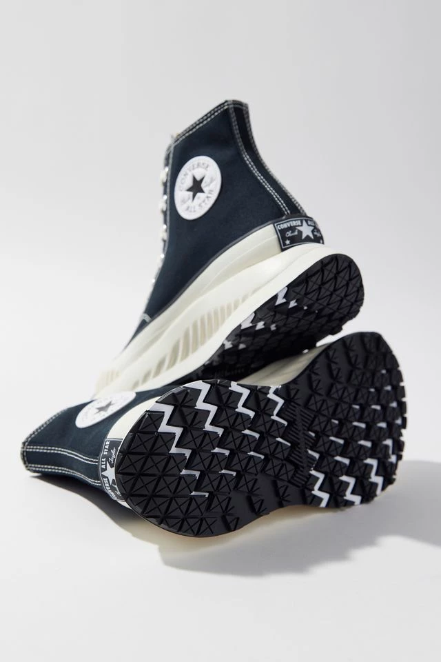 Futuristic CT70 sneakers by Converse in a high top silhouette with lace up closure. Canvas upper finished with diamond-textured tread at the exaggerated rubber soles.