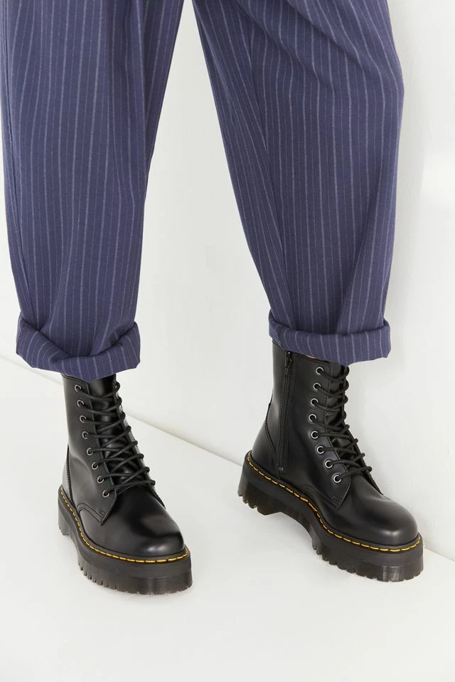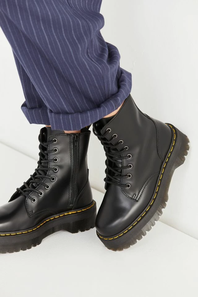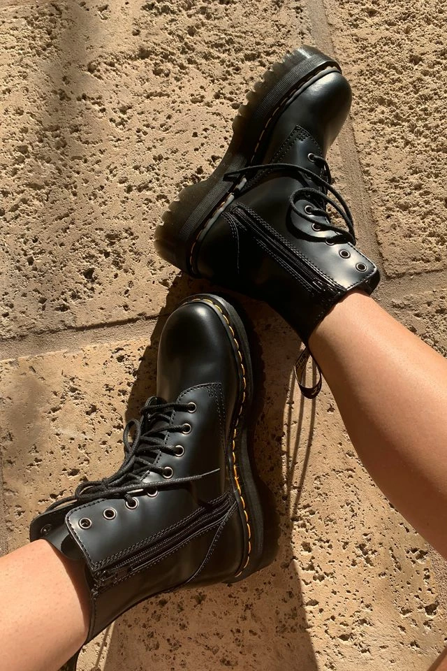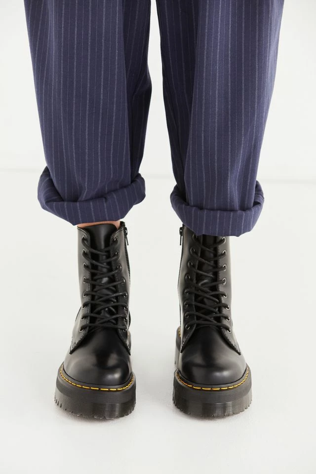 An icon reimagined with fiercely punk-inspired details in this platform iteration of Dr. Martens’ classic 8-eye combat boot. Smooth leather boot cut above ankle with an 8-eye lace-up closure and back pull tab. With their air-cushioned sole with top-stitch detailing complete with cotton laces, metal eyelets and a slightly raised heel. Finished with their signature slip-resistant rubber sole in a towering platform with iconic yellow stitching.