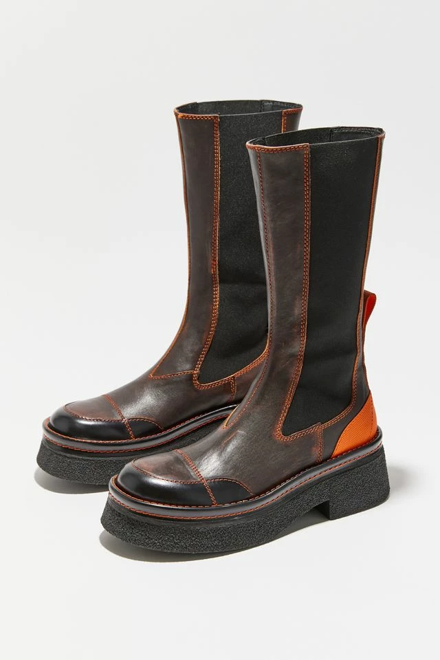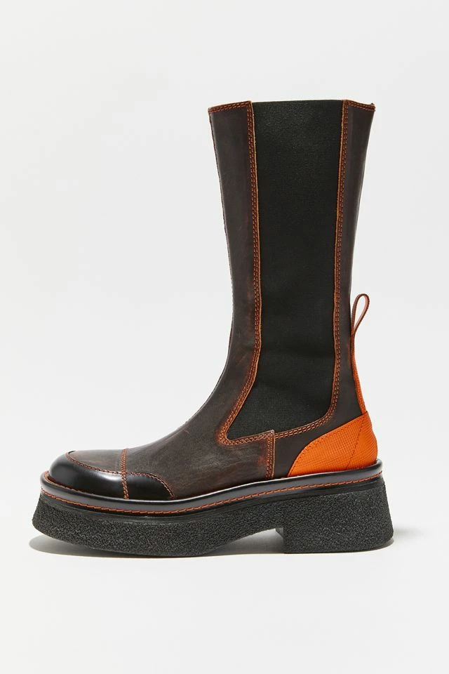 Tall leather boot from E8 By Miista with pop-color stitch detailing and matching heel pull tab. Inset with elastic panels for a stretch-fit. Rounded at the toe with a crepe sole and block heel.