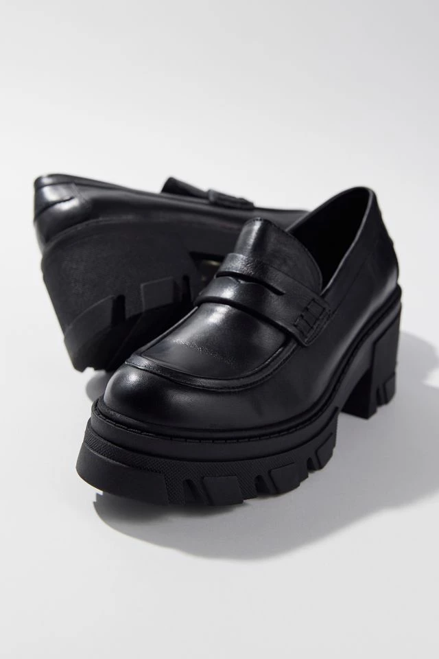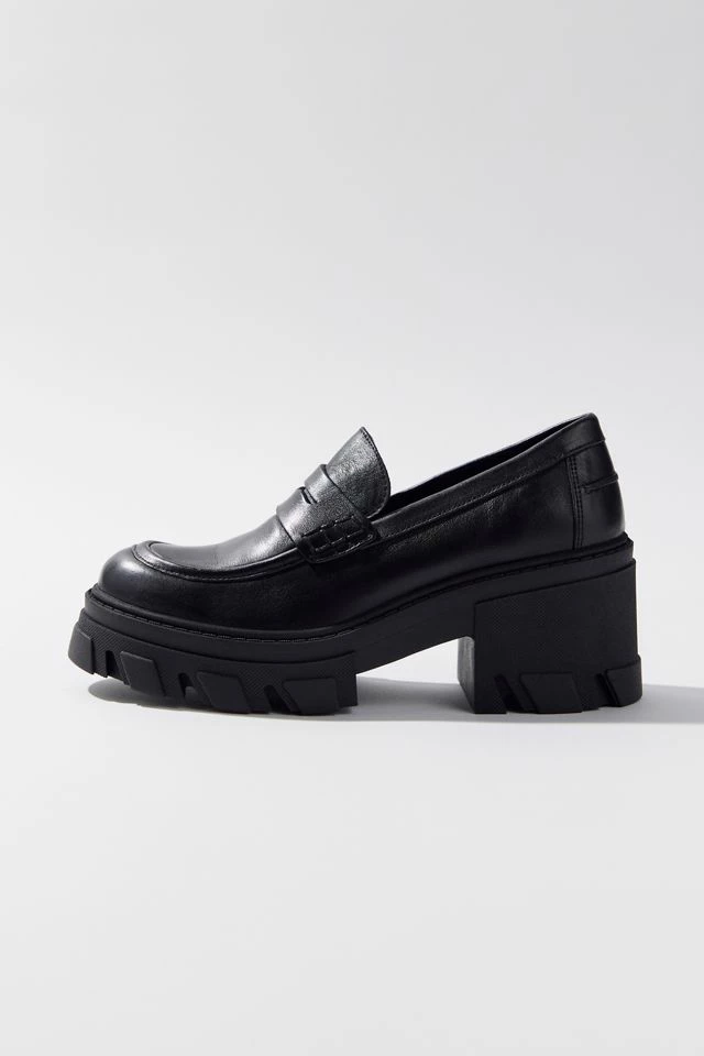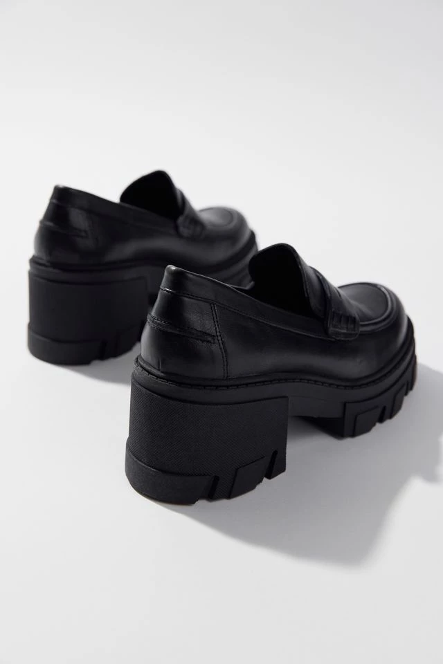 Platform penny loafers from Steve Madden. Classic faux leather upper trimmed with an ultra-chunky platform sole.