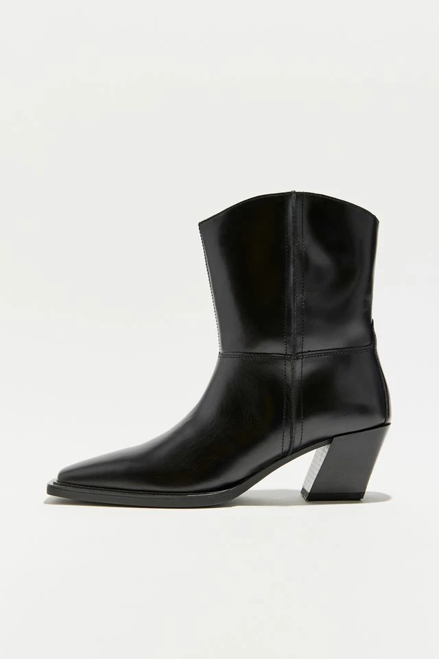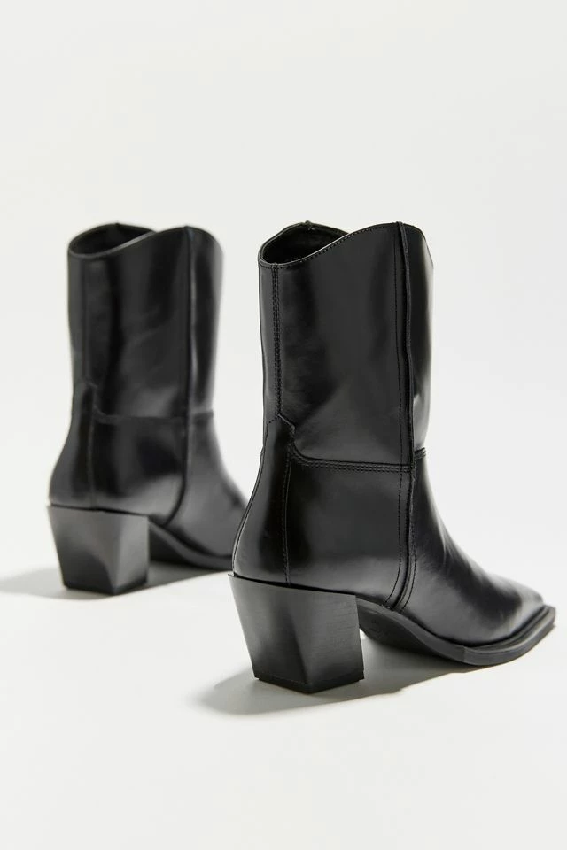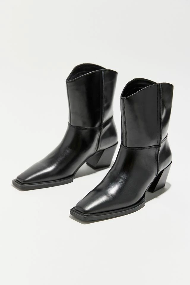 Western-inspired cowboy boots from Vagabond Shoemakers. Pull-on construction with pointed toes, elastic side panels and angled heels.
